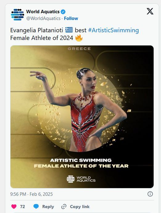 Η Ευαγγελία Πλατανιώτη σημείωσε μια τεράστια διάκριση για την ελληνική καλλιτεχνική κολύμβηση. Αναδείχθηκε η κορυφαία αθλήτρια του κόσμου για το 2024, σύμφωνα με την ψηφοφορία της Παγκόσμιας Ομοσπονδίας Υγρού Στίβου (World Aquatics), χάρη στις σπουδαίες διακρίσεις της στο παγκόσμιο πρωτάθλημα!
