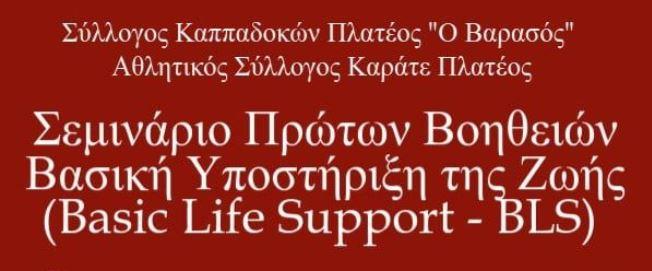 Ο Σύλλογος Καππαδοκών Πλατέος «Ο Βαρασός», σε συνεργασία με τον Αθλητικό Σύλλογο Καράτε Πλατέος, προσκαλούν όποιον ενδιαφέρεται να συμμετέχει σε πιστοποιημένο Σεμινάριο Βασικής Υποστήριξης Ζωής (Basic Life Support – BLS/AED), την Κυριακή 16 φεβρουαρίου 2025 και ώρες 15:00 μ.μ. – 20:00 μ.μ..