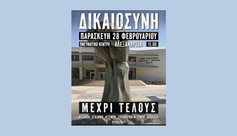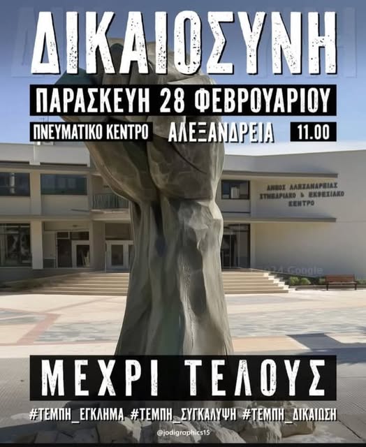 Ως «Ομάδα Δράσεων Ενεργών Πολιτών ΔΗΜΟΥ ΑΛΕΞΑΝΔΡΕΙΑΣ» συμμετέχουμε στο κάλεσμα διαμαρτυρίας του «Συλλόγου Συγγενών Θυμάτων Τεμπών 2023» και καλούμε όλους τους φορείς, συλλόγους και πολίτες να ενώσουν τη φωνή τους μαζί μας.