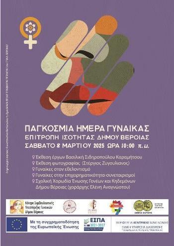 Η Δημοτική Επιτροπή Ισότητας του Δήμου Βέροιας σας προσκαλεί να τιμήσετε με την παρουσία σας τις εκδηλώσεις που διοργανώνονται με αφορμή την Παγκόσμια Ημέρα της Γυναίκας, το Σάββατο 8 Μαρτίου στην αίθουσα του Δημοτικού Συμβουλίου στο Δημαρχείο, από τις 10:00 το πρωί.