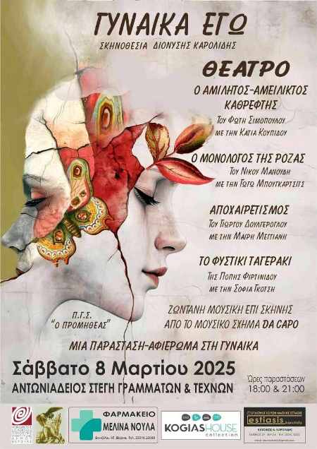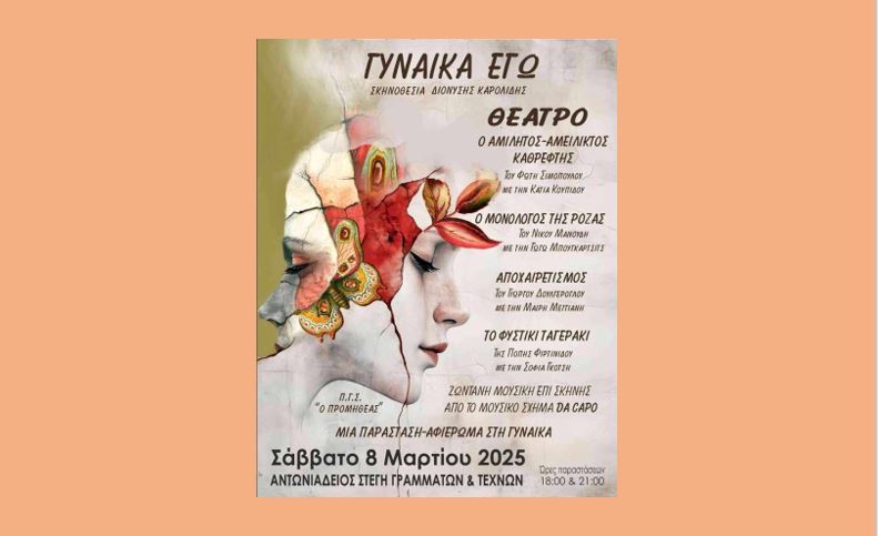 Στην καρδιά της Βέροιας, στον επιβλητικό χώρο της Αντωνιαδείου Στέγης Γραμμάτων & Τεχνών, το Σάββατο 8 Μαρτίου 2025, ένα θεατρικό αφιέρωμα στη γυναίκα υπόσχεται να συγκινήσει και να ταξιδέψει το κοινό.«Γυναίκα Εγώ», μια πολυδιάστατη παράσταση σε σκηνοθεσία του Διονύση Καρολίδη, που ανεβάζει ο Πολιτιστικός Σύλλογος “Προμηθέας”, αναδεικνύει τη βαθιά ψυχοσύνθεση της γυναικείας ύπαρξης μέσα από τέσσερα ξεχωριστά θεατρικά έργα. Ο καθρέφτης της σιωπής, η μοναξιά του αποχαιρετισμού, η δύναμη της Ρόζας και η γεύση από ένα «φυστίκι ταγεράκι» γίνονται το όχημα για ένα συναίσθημα που ξεπερνά τον χρόνο και τη σκηνή.Η παράσταση περιλαμβάνει:«Ο Αμίλητος-Αμείλικτος Καθρέφτης» του Φώτη Σιμοπούλου, με την Κατία Κουπίδου, όπου το είδωλο αντικρίζει την αλήθεια που δεν λέγεται.