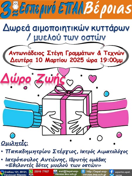 Σας Προσκαλούμε σε Εκδήλωση με τίτλο: «Δωρεά αιμοποιητικών κυττάρων / μυελού των οστών: Δώρο ζωής» του 3ου Εσπερινού ΕΠΑΛ Βέροιας, τη Δευτέρα 10-03-2025, στις 19:00 μ.μ. στην Αντωνιάδειο Στέγη Γραμμάτων και Τεχνών.