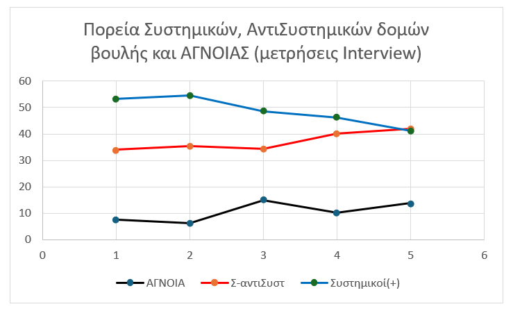 Ας δούμε πρώτα το νέο ενημερωμένο γράφημα της Interview, για τους τρεις παράγοντες που ελέγχθηκαν στο προηγούμενο άρθρο: Τα σύνολα των συστημικών και αντισυστημικών δομών του ελληνικού κοινοβουλίου και της άγνοιας επιλογής:
