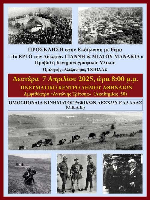 Εκδήλωση: “Το έργο των Αδελφών Γιάννη & Μίλτου Μανάκια” / Πνευματικό Κέντρο Δήμου Αθηναίων, Δευτέρα 7 Απριλίου