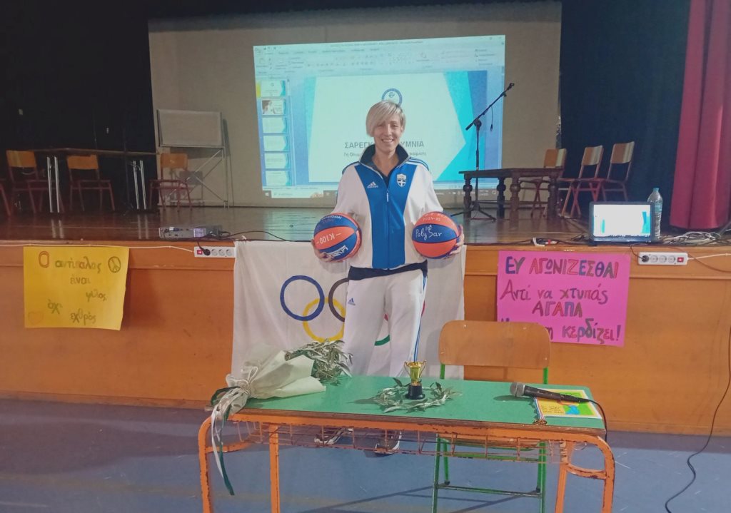 Την Τετάρτη 2 Απριλίου επισκέφθηκε το σχολείο μας ,μία ξεχωριστή προσωπικότητα του Ελληνικού Αθλητισμού, μία σπουδαία Μπασκετμπολίστρια ,η κ. Πολύμνια Σαρέγκου.