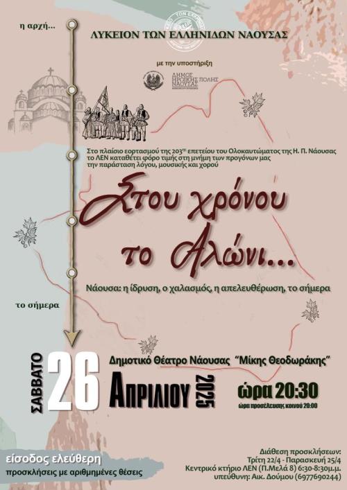 Στο πλαίσιο των εκδηλώσεων της 203ης επετείου του Ολοκαυτώματος Νάουσας το Λύκειο των Ελληνίδων Νάουσας με την υποστήριξη του Δήμου της Η.Π. Νάουσας, θα παρουσιάσει το τρίτο μέρος ενός τρίπτυχου αφιερώματος στην ιστορία της Νάουσας, με τίτλο: