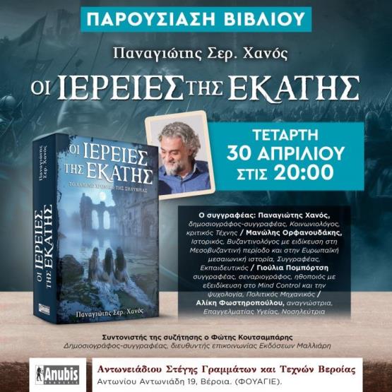 Το νέο βιβλίο του δημοσιογράφου – συγγραφέα, Παναγιώτη Χανού,“Οι Ιέρειες της Εκάτης” από τις εκδόσεις ANUBISΟ, παρουσιάζει η ΚΕΠΑ Δήμου Βέροιας, την Τετάρτη 30 Απριλίου στο φουαγιέ της Αντωνιάδειας Στέγης Γραμμάτων και Τεχνών Βέροιας, στις 8.00 μ.μ.