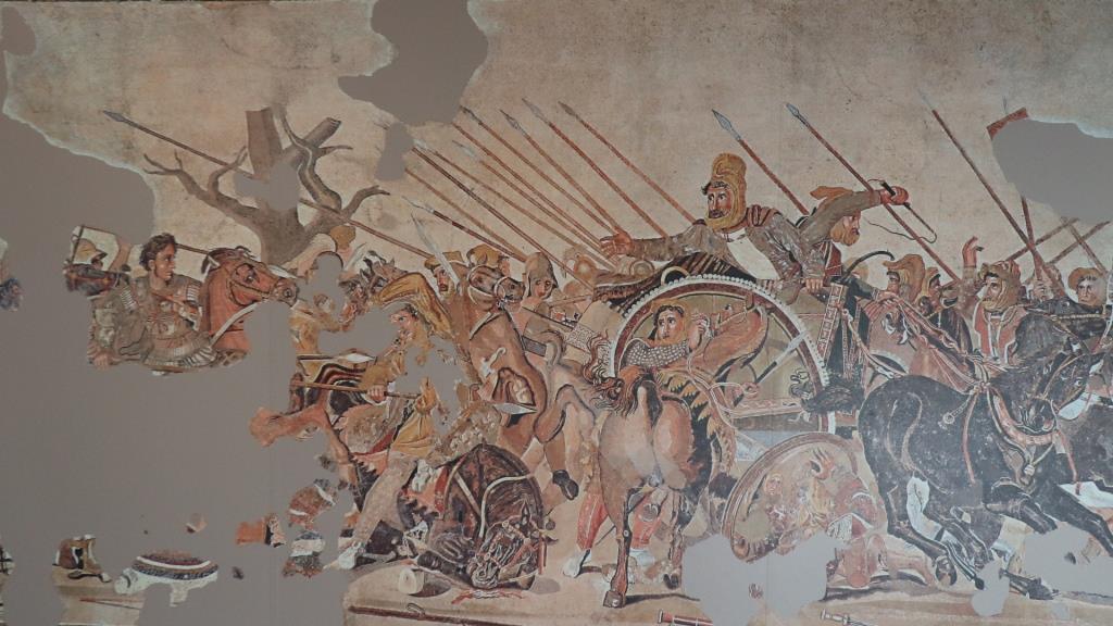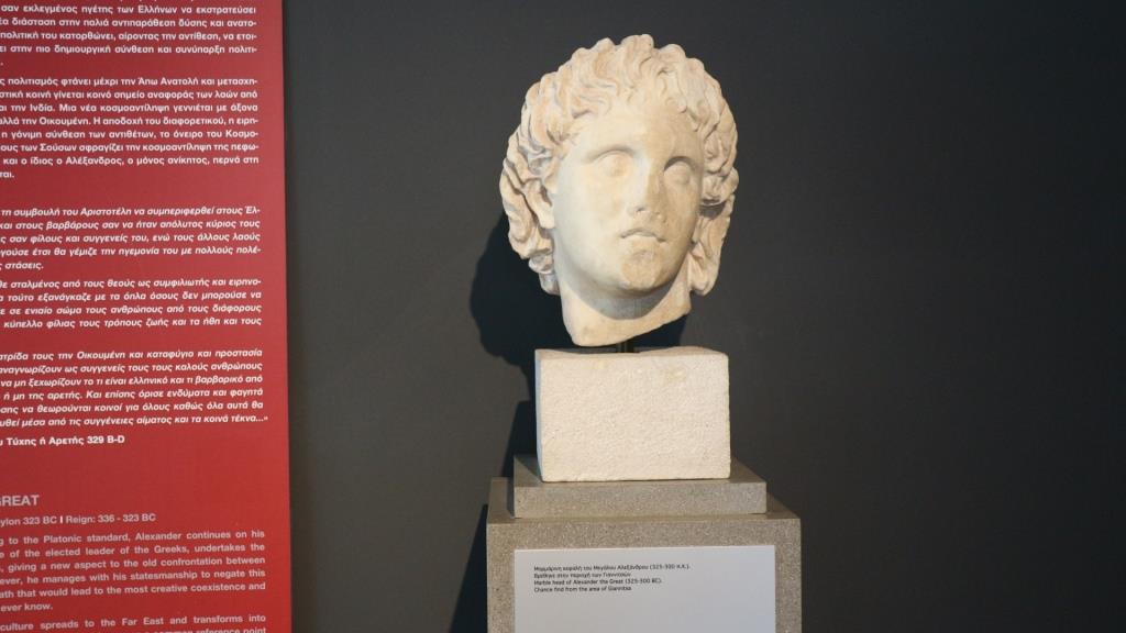Από την είσοδο οδηγείται κανείς σε κεφαλή του Αλέξανδρου, ένα από τα ωραιότερα πορτρέτα του, (ίσως έργο του Λυσίππου), και στη συνέχεια σε ολόσωμη σε μικρογραφία αναπαράστασή του με τα κέρατα του Θεού Πάνα να διακρίνονται στο κεφάλι του, πρόθεση να θεοποιηθεί ως ηγεμόνας της Μακεδονίας ήδη από τα πρώτα χρόνια της βασιλείας του.