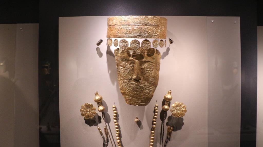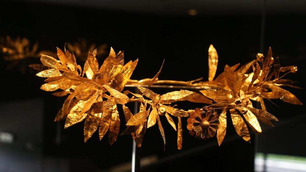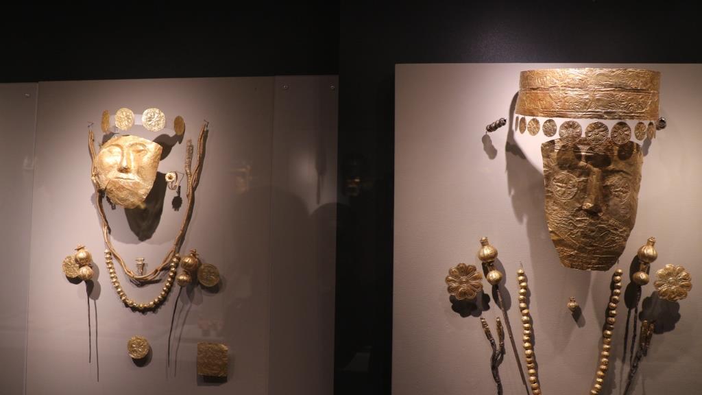 Κτερίσματα από το νεκροταφείο της Πέλλας, όπου ο χρυσός σε νεκρικές μάσκες ή κοσμήματα περισσεύει, αποδεικνύει τον πλούτο της αρχαίας πόλης και είναι αντικριστά εκτεθειμένα με περικεφαλαίες ή ξίφη πολεμιστών.