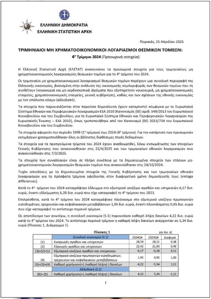 Η κατάσταση γίνεται ακόμη πιο εμφανής αν λάβουμε υπόψη τα συνολικά δεδομένα της οικονομίας. Ο καθαρός δανεισμός της συνολικής οικονομίας (S.1) ανήλθε σε 4,22 δισ. ευρώ το τελευταίο τρίμηνο, μειωμένο σε σχέση με το 2023 (5,34 δισ. ευρώ), αλλά η βελτίωση οφείλεται κυρίως στο πλεόνασμα του εξωτερικού ισοζυγίου πρωτογενών εισοδημάτων (+1,95 δισ. ευρώ) και όχι σε βελτίωση της οικονομικής συμπεριφοράς των νοικοκυριών.