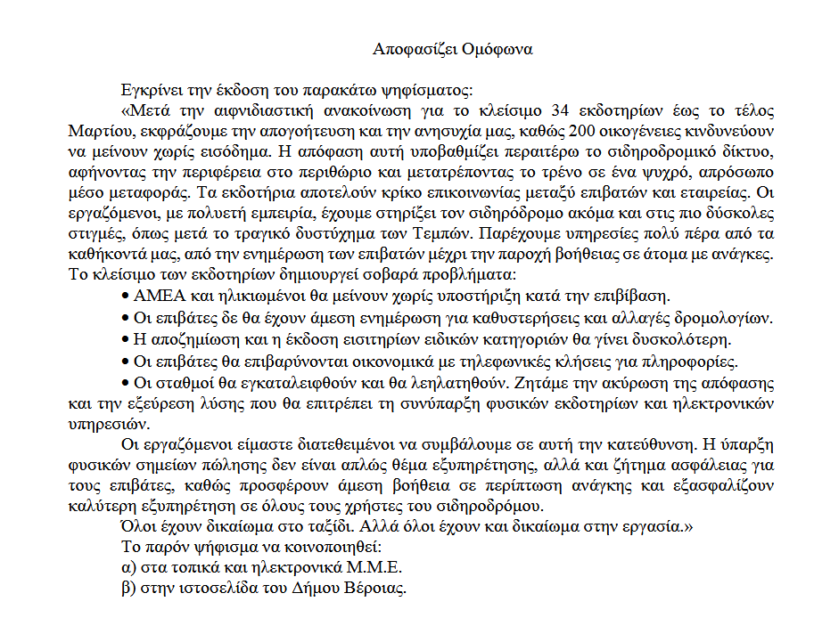 Το Δημοτικού Συμβουλίου Βέροιας ενέκρινε το παρακάτω ομόφωνα ψήφισμα ενάντια στο κλείσιμοτων Εκδοτηρίων Σιδηροδρομικών Σταθμών από την Hellenic Train