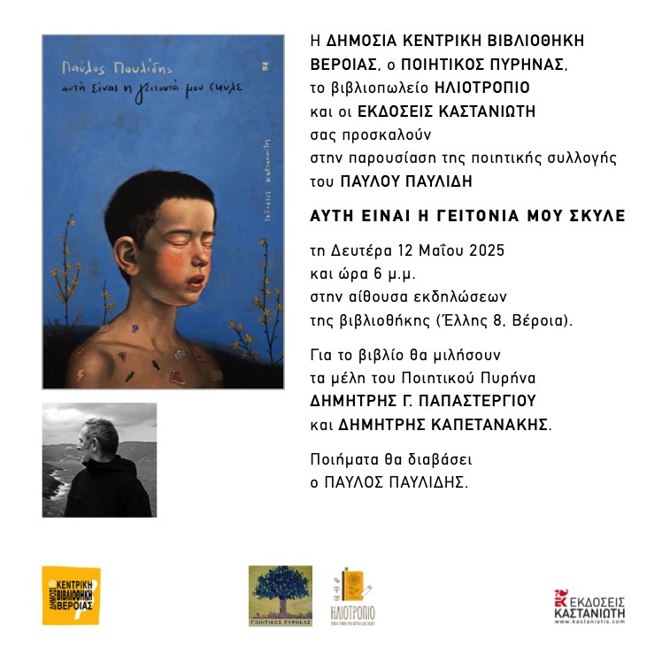 Η Δημόσια Κεντρική Βιβλιοθήκη Βέροιας, ο Ποιητικός Πυρήνας, το βιβλιοπωλείο Ηλιοτρόπιο και οι Εκδόσεις Καστανιώτη σας προσκαλούν στην παρουσίαση της ποιητικής συλλογής του Παύλου Παυλίδη