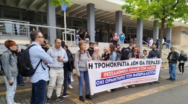 Καταδικάζουμε την απαράδεκτη σημερινή δικαστική απόφαση ενάντια σε αγωνιστές συναδέλφους μας, που επιβάλει ποινή φυλάκισης 8 έως 15 μηνών με αναστολή, γιατί την ημέρα της απεργιακής διαδήλωσης στις 6 Απρίλη του 2022, σε μια συμβολική κίνηση έγραψαν αντιπολεμικά συνθήματα σε βρετανικά τροχοφόρα στρατιωτικά οχήματα στο λιμάνι της Θεσσαλονίκης.