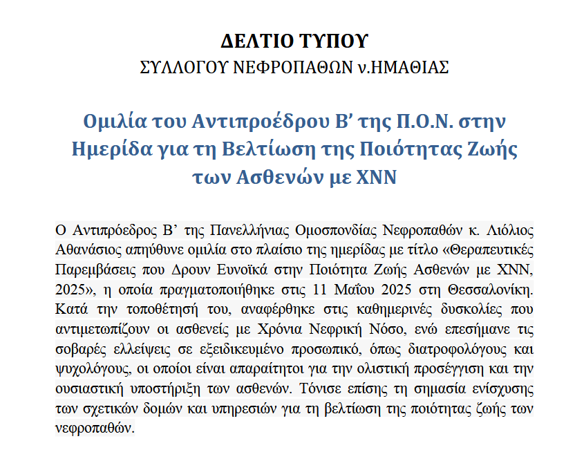 Από τον Σύλλογο Νεφροπαθών Ημαθίας πήραμε το Δελτίο Τύπου που ακολουθεί: