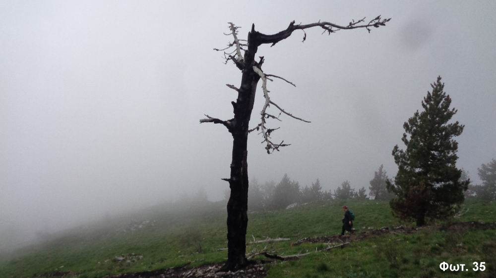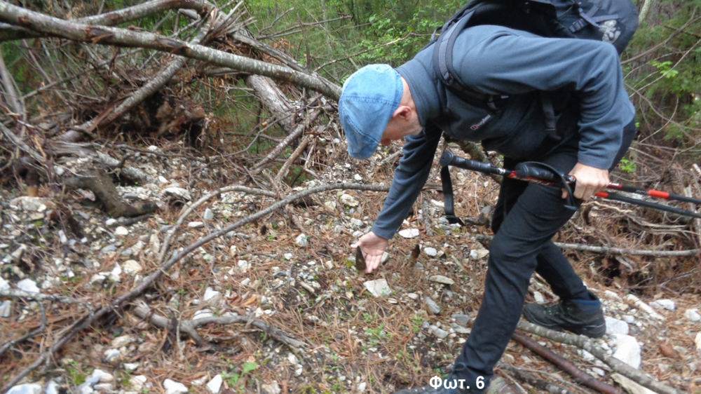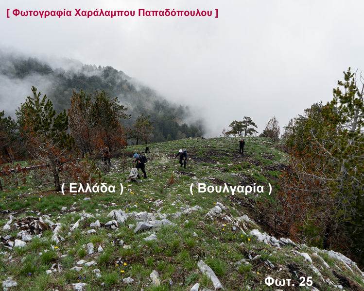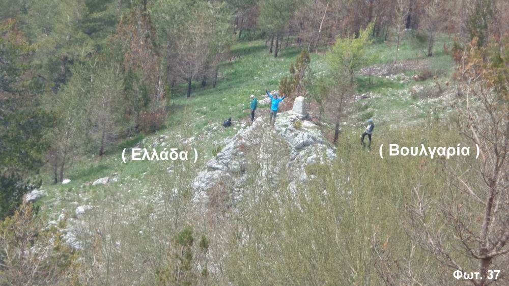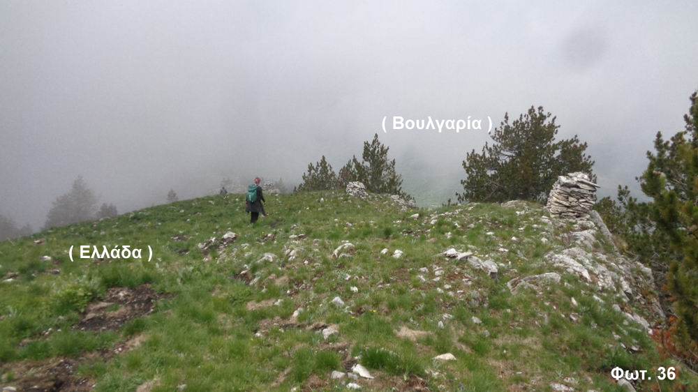 Ακολουθούσαμε το αυλάκι που χώριζε το βουνό σε δύο κράτη και για σημάδια είχαμε τους πέτρινους κούκους (πέτρες τοποθετημένες τη μία πάνω στην άλλη σε σχήμα «πύργου») και τις αριθμημένες πυραμίδες συνόρων, που από τη μια πλευρά έχουν το ‘‘Ε’’ = Ελλάδα και από την άλλη το ‘‘НРБ’’ = Βουλγαρία (φωτ. 18).
