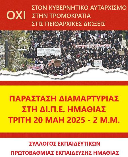 Κάλεσμα σε παράσταση διαμαρτυρίας ενάντια στον εντεινόμενο κυβερνητικό αυταρχισμό, την τρομοκρατία και τις πειθαρχικές διώξεις, Τρίτη 20 Μάη, στις 2 μ.μ., στα γραφεία της ΔΙΠΕ Ημαθίας
