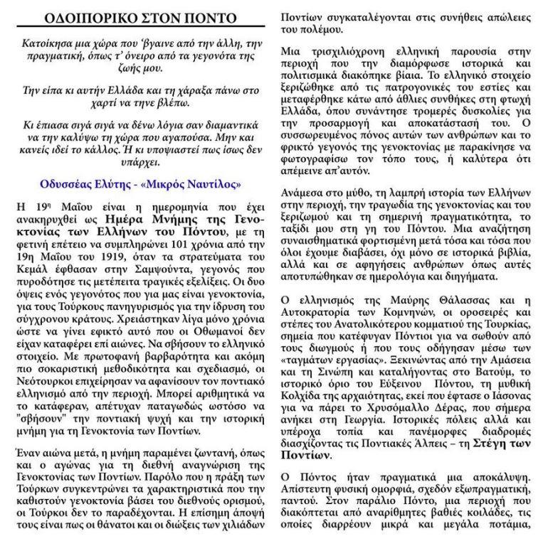 Σήμερα 19 Μαΐου, μέρα αφιερωμένη στην Ποντιακή Γενοκτονία και η μνήμη γυρνά πίσω. Όσο κι αν εμείς, όσοι ανήκουμε στους Πόντιους της τρίτης γενιάς, δεν ζήσαμε τα γεγονότα, ο Πόντος υπάρχει μέσα μας, ζει μέσα μας, σαν μια μακρινή άλλη πατρίδα…