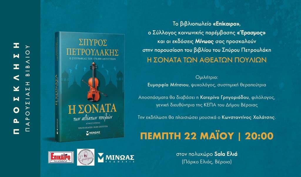 Το βιβλιοπωλείο «ΕΠΙΚΑΙΡΟ», ο Σύλλογος Κοινωνικής Παρέμβασης «ΕΡΑΣΜΟΣ» και οι εκδόσεις «ΜΙΝΩΑΣ» παρουσιάζουν το νέο μυθιστόρημα του δημοφιλούς συγγραφέα Σπύρου Πετρουλάκη «Η Σονάτα των Αθέατων Πουλιών», την Πέμπτη 22 Μαΐου 2025 στην αίθουσα “SALA” του Πολυχώρου Ελιά στις 20.00.