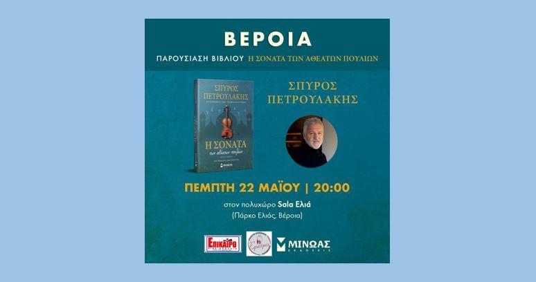 Το βιβλιοπωλείο «ΕΠΙΚΑΙΡΟ», ο Σύλλογος Κοινωνικής Παρέμβασης «ΕΡΑΣΜΟΣ» και οι εκδόσεις «ΜΙΝΩΑΣ» παρουσιάζουν το νέο μυθιστόρημα του δημοφιλούς συγγραφέα Σπύρου Πετρουλάκη «Η Σονάτα των Αθέατων Πουλιών», την Πέμπτη 22 Μαΐου 2025 στην αίθουσα “SALA” του Πολυχώρου  Ελιά στις 20.00.