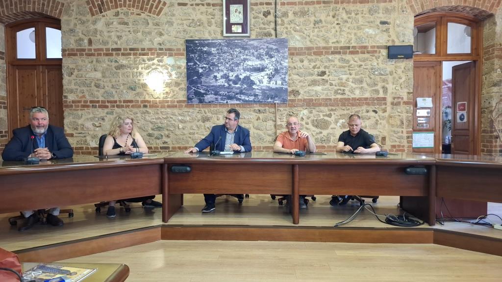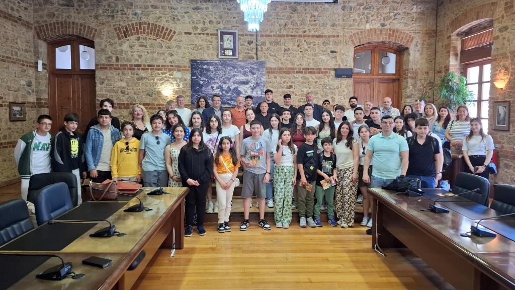 Στη συνέχεια, μετέβησαν στο Δημαρχείο της πόλης, όπου τους υποδέχθηκαν εκ μέρους του Δημάρχου κ. Κων/νου Βοργιαζίδη, ο Αντιδήμαρχος καθαριότητας, ανακύκλωσης, περιβάλλοντος και πολιτικής προστασίας κ. Βασίλης Παπαδόπουλος και ο Αντιδήμαρχος τουρισμού κ. Λάζαρος Ασλανίδης. Στην αίθουσα του Δημοτικού Συμβουλίου, ο κ. Παπαδόπουλος καλωσόρισε την ΠΜΓΣ (Πατριαρχική Μεγάλη του Γένους Σχολή), τονίζοντας τους δεσμούς με την Πόλη και την τιμή να φιλοξενείται το αρχαιότερο ελληνικό εκπαιδευτικό ίδρυμα στον κόσμο. Ακολούθως, ο Σχολάρχης κ. Δημήτριος Ζώτος ευχαρίστησε για τη φιλοξενία και την ευκαιρία να γνωρίσει η ΠΜΓΣ τη γη του Μ. Αλεξάνδρου και τα χνάρια του Αποστόλου Παύλου και ο κ. Ασλανίδης αναφέρθηκε στην ιστορική αξία της Βέροιας, μιας αρχαίας πόλης, εξαιρετικά σπουδαίας και χτισμένης σε τέσσερις φάσεις. Επίσης, η κ. Ολυμπία Μπέτσα, η Βεροιώτισσα φιλόλογος, που εδώ και τέσσερα χρόνια είναι αποσπασμένη στην ΠΜΓΣ, εξέφρασε τις ευχαριστίες της και τόνισε με συγκίνηση τη σημασία της έλευσης της ΠΜΓΣ στην πόλη της και στο σχολείο όπου μαθήτευσε η ίδια (νυν Δημαρχείο). Στο τέλος της επίσκεψης, ανταλλάχθηκαν αναμνηστικά δώρα μεταξύ του σχολείου και του Δήμου Βέροιας.
