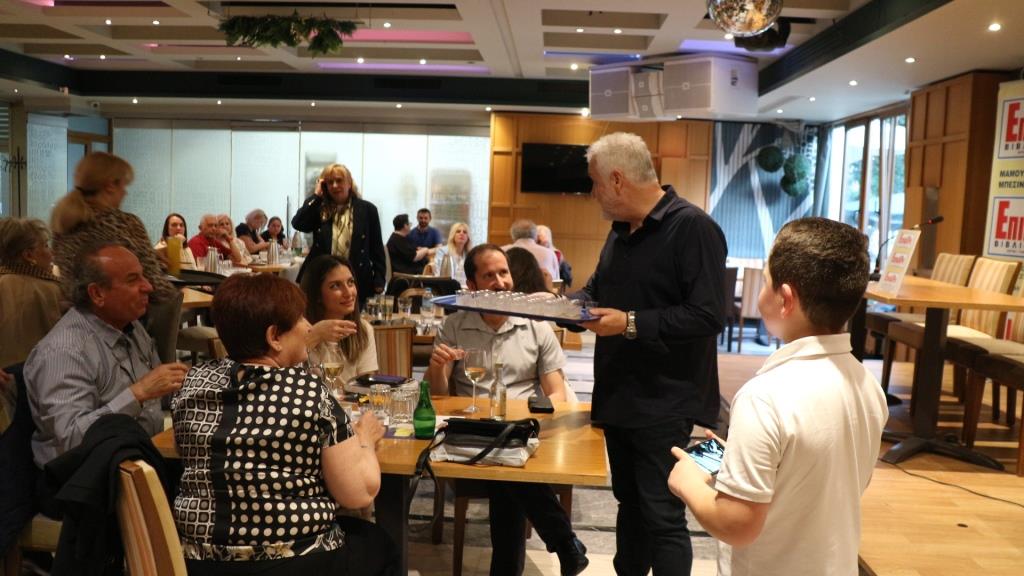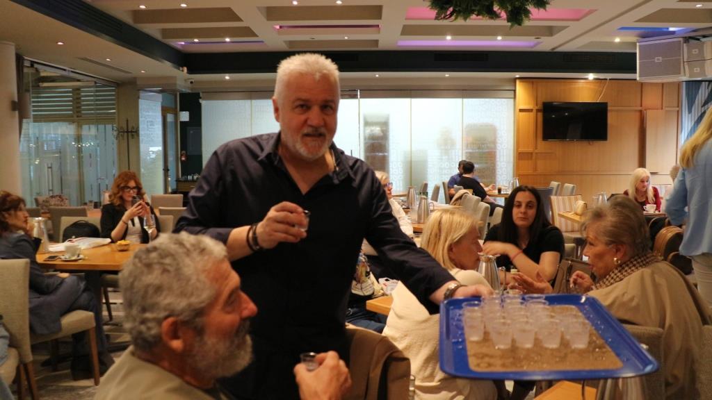Περνώντας από τα τραπέζια κερνούσε τις κρητικές ρακές, έθιμο ταυτισμένο με την πατρίδα του, δημιουργώντας το ανάλογο δεκτικό κλίμα.