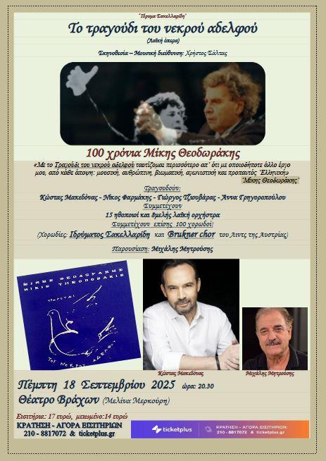 100 χρόνια Μίκης Θεοδωράκης: “Το τραγούδι του νεκρού αδελφού” – Κώστας Μακεδόνας – Μιχάλης Μητρούσης / Θέατρο Βράχων, Πέμπτη 18 Σεπτεμβρίου