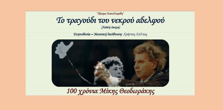 Γραμμένο το 1961, το ‘Τραγούδι του νεκρού αδελφού’ είναι το μοναδικό θεατρικό έργο του Μίκη Θεοδωράκη, και το οποίο πλαισιώνεται με τα κορυφαία τραγούδια του μεγάλου Έλληνα δημιουργού (Ένα δειλινό, Δυό γιους είχες μανούλα μου –όνειρο-, Τον Παύλο και τον Νικολιό, Στα περβόλια, Απρίλη μου, Κοιμήσου αγγελούδι μου, Προδομένη μου αγάπη κ.α).