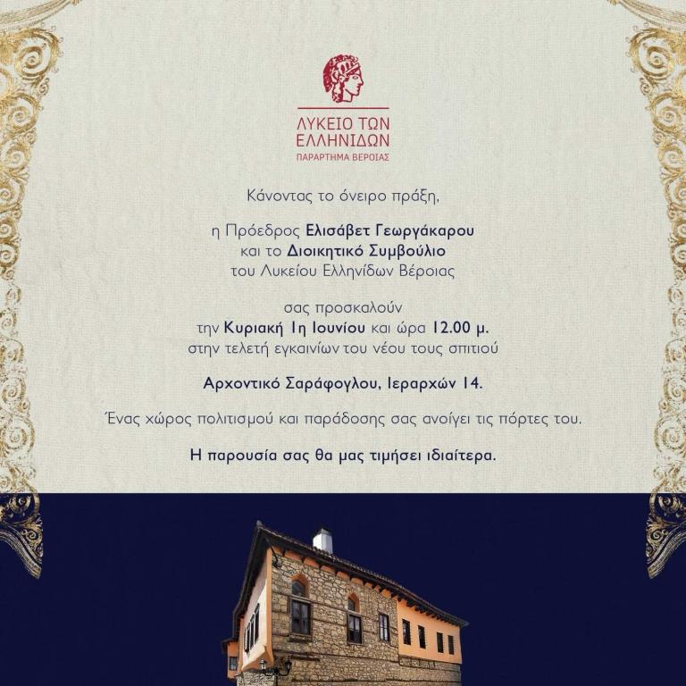 Το Λύκειο Ελληνίδων – Παράρτημα Βέροιας (Λ.Ε.Β.) βρίσκεται στην ευχάριστη θέση να εγκαινιάζει την νέα του στέγη, στο Αρχοντικό Σαράφογλου, επί της οδού Ιεραρχών 14, στη Βέροια, την Κυριακή 1 Ιουνίου 2025, ώρα 12:00 το μεσημέρι. Το κτίριο παραχωρήθηκε στο Λ.Ε.Β. για χρήση, με την 303/2020 Απόφαση του Δήμου Βέροιας, επί Δημαρχίας Κωνσταντίνου Βοργιαζίδη.