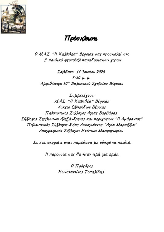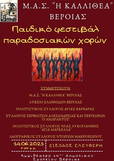 ΜΑΣ “Η Καλλιθέα” Βέροιας – 1ο παιδικό φεστιβάλ παραδοσιακών χορών / Σάββατο 14 Ιουνίου. Αμφιθέατρο 10ου Δημοτικού Σχολείου Βέροιας
