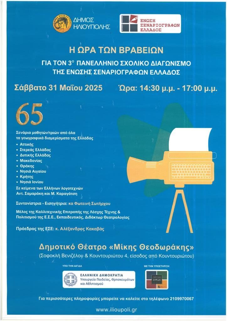 Το Σάββατο, 31 Μαΐου, στο κατάμεστο από μαθητές, εκπαιδευτικούς και γονείς από όλα τα μέρη της Ελλάδος αμφιθέατρο του Δήμου Ηλιούπολης έλαβε χώρα η τελετή βράβευσης των διακριθέντων στον 3ο Πανελλήνιο Διαγωνισμό Συγγραφής Σεναρίου εκ Διασκευής Ελληνικού Διηγήματος της Ένωσης Σεναριογράφων Ελλάδος με την υποστήριξη της Λέσχης Τέχνης και Πολιτισμού της Ε.Σ.Ε. και του Ινστιτούτου Εκπαιδευτικής Πολιτικής.