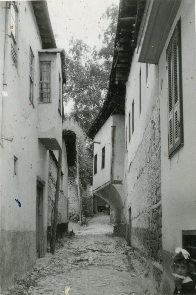Οδός Γεωργίου Γουδή σε φωτογραφία του 1958, πλακόστρωτο. Στο βάθος ο πλάτανος της οδού Κεντρικής και το καφενείο του Απόλλωνα Τσακίρη