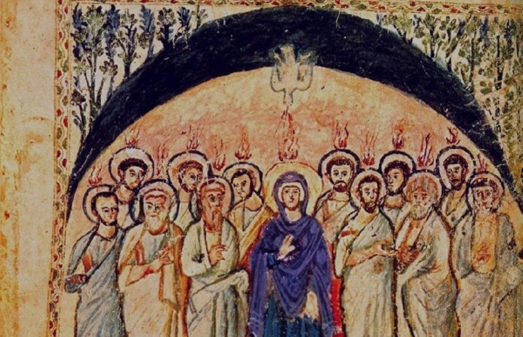 «Όταν έφθασε ή μέρα της Πεντηκοστής, ήταν όλοι οι πιστοί μαζί στο ίδιο μέρος. Και ξαφνικά ήρθε από τον ουρανό βοή, πού έμοιαζε σαν να φυσά δυνατός άνεμος, και γέμισε το σπίτι πού κάθονταν. Και παρουσιάστηκαν γλώσσες σαν φλόγες φωτιάς να διαμοιράζονται σ’ αυτούς και να κάθεται από μια στον καθένα και όλοι γέμισαν από Πνεύμα Άγιο» (Πράξ. 2,1-4).