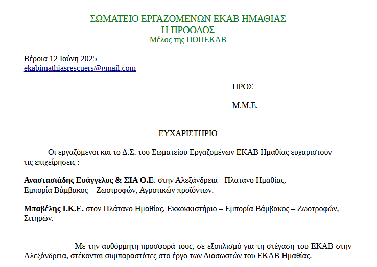 Κοινωνική ζωή Τοπικά Ευχαριστήριο Σωματείου ΕΚΑΒ Ημαθίας Faretra.info 12/06/2025, 15:13 Share on Facebook Share on Twitter Send with mail Οι εργαζόμενοι και το Δ.Σ. του Σωματείου Εργαζομένων ΕΚΑΒ Ημαθίας ευχαριστούν: Φαρέτρα ΕΚΑΒ Ημαθίας Ευχαριστήριο ΣΧΕΤΙΚΑ ΑΡΘΡΑ Δεν υπάρχουν σχετικά άρθρα.