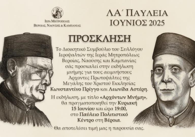 Εκδήλωση μνήμης – ΛΑ’ Παύλεια: Ο Σύλλογος Ιεροψαλτών τιμά την μνήμη δυο αειμνήστων Αρχόντων Πρωτοψαλτών / Βέροια, Κυριακή 15 Ιουνίου
