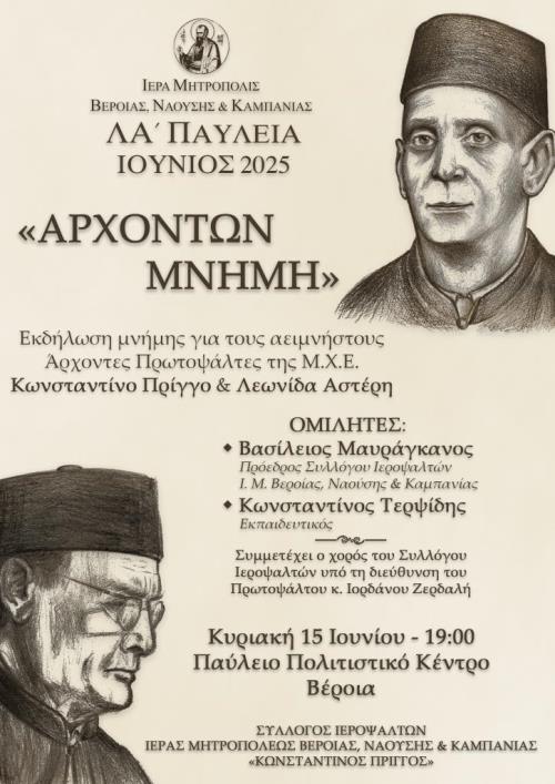 Ο Σύλλογος Ιεροψαλτών της Ιεράς Μητροπόλεως Βεροίας, Ναούσης και Καμπανίας «Κωνσταντίνος Πρίγγος», στο πλαίσιο των ΛΑ’ Παυλείων, τιμά σε εκδήλωση, που διοργανώνει, τη μνήμη δύο αειμνήστων Αρχόντων Πρωτοψαλτών της Μεγάλης του Χριστού Εκκλησίας: του Κωνσταντίνου Πρίγγου (+1964) και του Λεωνίδα Αστέρη (+2024).