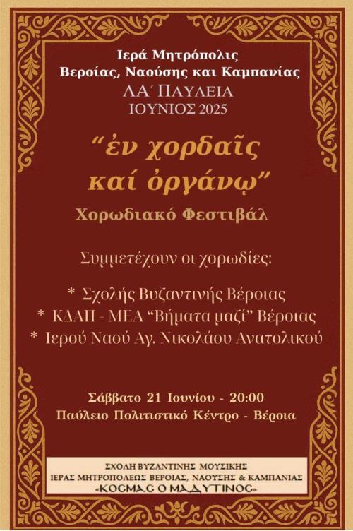 Η Σχολή Βυζαντινής Μουσικής της Ιεράς Μητροπόλεως Βεροίας, Ναούσης και Καμπανίας «Κοσμάς ο Μαδυτινός» στο πλαίσιο των ΛΑ΄ΠΑΥΛΕΙΩΝ και τιμώντας την Παγκόσμια Ημέρα Μουσικής, διοργανώνει Χορωδιακό Φεστιβάλ με τίτλο: «Εν χορδαίς και οργάνω», το Σάββατο 21 Ιουνίου 2025 και ώρα 8:00 μ.μ. στο Παύλειο Πολιτιστικό Κέντρο στη Βέροια.