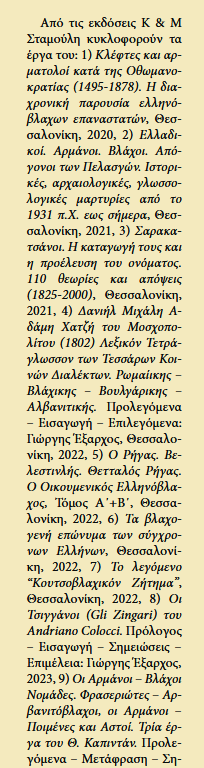 Το βιβλίο –ολοκληρωμένο ήδη από το 2006–, το έχω «χτενίσει, ξαναχτενίσει» ως προς τη γλώσσα και το ύφος και ως προς τα Λεξιλόγια, λαμβάνοντας υπ’ όψιν και κάποια νεότερα βλαχολογικά δεδομένα, όπως φαίνονται στη Βιβλιογραφία.