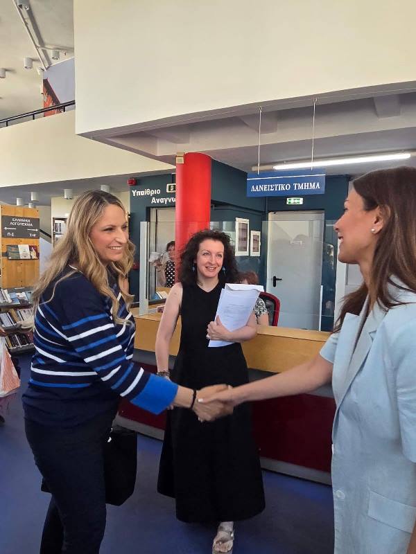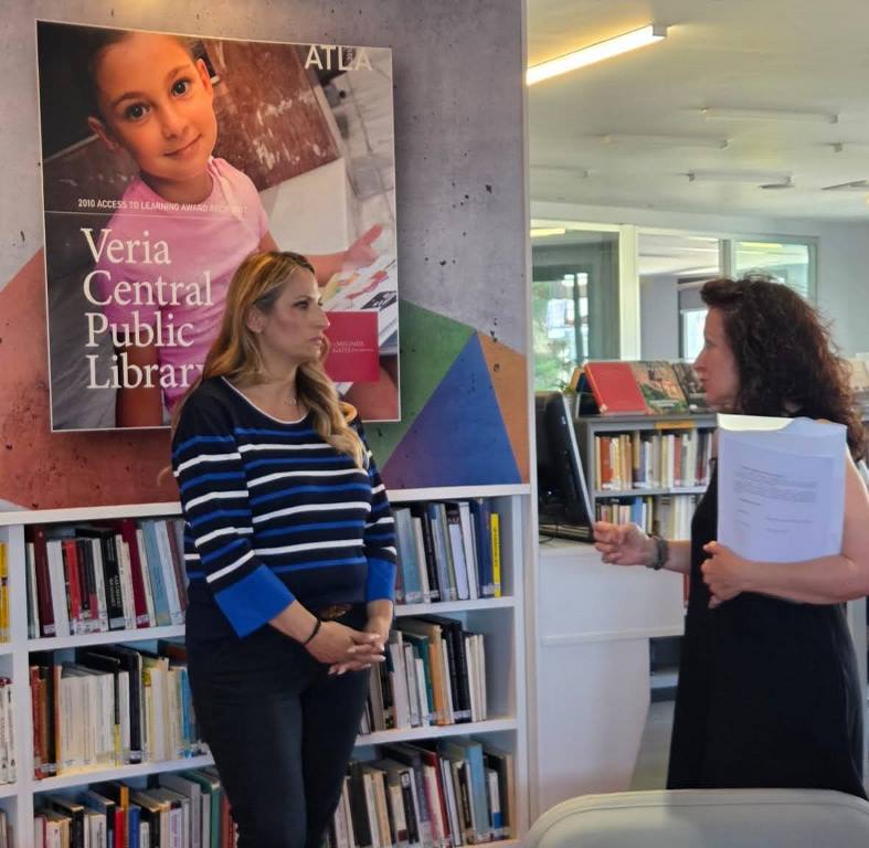 Κατά τη διάρκεια της επίσκεψής της, βρέθηκε και στη Δημόσια Βιβλιοθήκη της Βέροιας, έναν πολιτιστικό φάρο της περιοχής με διεθνή αναγνώριση. Την υποδέχθηκαν θερμά η Πρόεδρος της Εφορείας της Βιβλιοθήκης, κα Αικατερίνη Σίμπου και ο Αν. Διευθυντής κ. Αντώνης Γκαλίτσιος, ενώ την ξενάγησε στους χώρους η υπεύθυνη βιβλιοθηκονόμος, κα Ασπασία Τασιοπούλου. Επίσης, πραγματοποιήθηκε συνάντηση με τον πρώην Διευθυντή της Βιβλιοθήκης, κ. Ιωάννη Τροχόπουλο, ο οποίος έχει συμβάλει καθοριστικά στη δημιουργία και την εξέλιξή της.