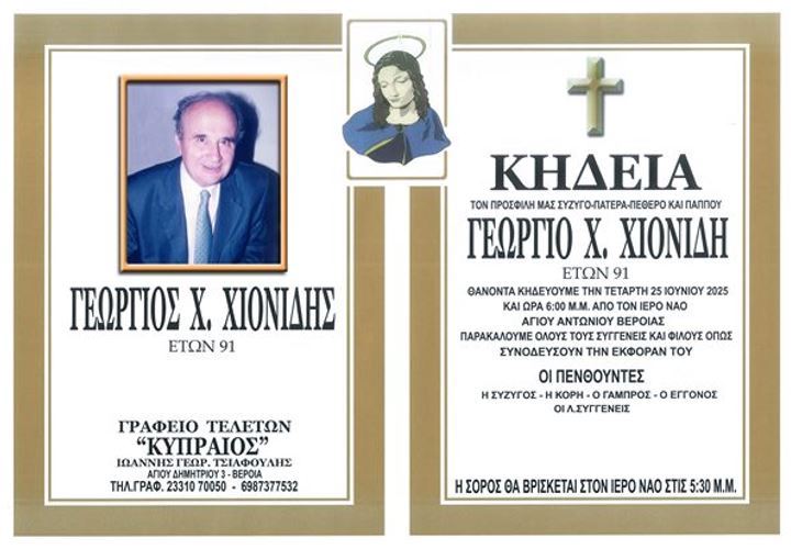 Σήμερα, Τετάρτη 25 Ιουνίου, 6 μμ στον Άγιο Αντώνιο, η κηδεία του Γιώργου Χιονίδη που έφυγε σήμερα από τη ζωή στα 91 του χρόνια.