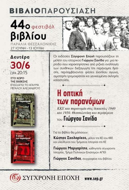 - ΔΕΥΤΕΡΑ 30/6 8.15‘ “Η ΟΠΤΙΚΗ ΤΩΝ ΠΑΡΑΝΟΜΩΝ: ΚΚΕ ΚΑΙ ΠΑΡΑΝΟΜΙΑ ΣΤΙΣ ΔΕΚΑΕΤΙΕΣ 1940 ΚΑΙ 1950“ΤΟΥ ΓΙΩΡΓΟΥ ΣΑΝΙΔΑ.