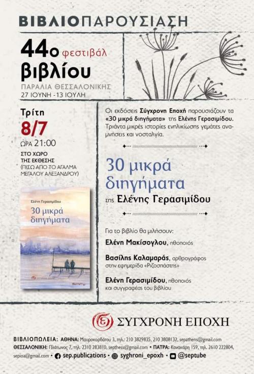 - ΤΡΙΤΗ 8/7 9.00′ ”30 ΜΙΚΡΑ ΔΙΗΓΗΜΑΤΑ” ΤΗΣ ΕΛΕΝΗΣ ΓΕΡΑΣΙΜΙΔΟΥ