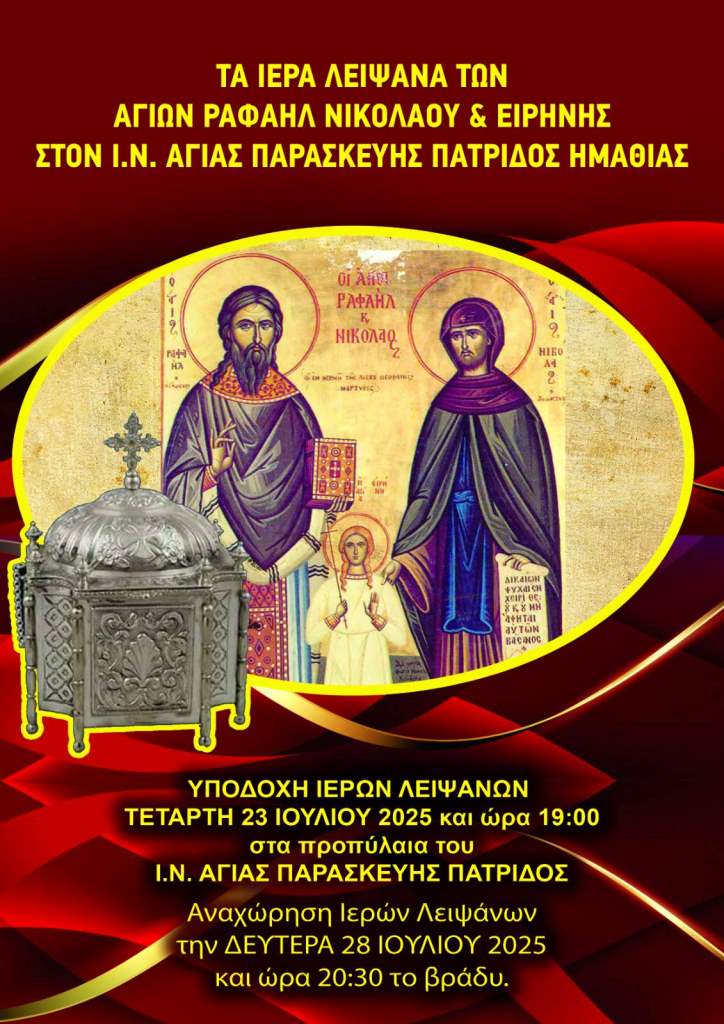 Τα λείψανα των αγίων Ραφαήλ, Νικολάου και Ειρήνης υποδέχεται η Πατρίδα Βέροιας / από 23 έως και τις 28 Ιουλίου
