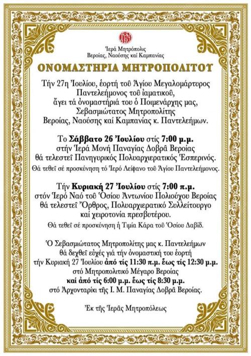 Τήν 27η Ἰουλίου, ἑορτή τοῦ Ἁγίου Μεγαλομάρτυρος Παντελεήμονος τοῦ ἰαματικοῦ, ἄγει τά ὀνομαστήριά του ὁ Ποιμενάρχης μας, Σεβασμιώτατος Μητροπολίτης Βεροίας, Ναούσης καί Καμπανίας κ. Παντελεήμων.