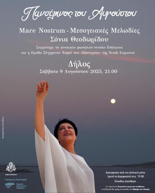 Η διεθνούς φήμης σοπράνο Σόνια Θεοδωρίδου επιστρέφει στο ελληνικό φως με το μουσικό πρόγραμμα «Mare Nostrum – Μεσογειακές Μελωδίες», ένα ταξίδι στις μουσικές ακτές της Μεσογείου. Τραγούδια της ευλογημένης θάλασσας που υφαίνουν έναν καμβά από ήχους, συναισθήματα, μνήμες και πάθη των λαών της Μεσογείου, κάτω από το φως της αυγουστιάτικης πανσελήνου.