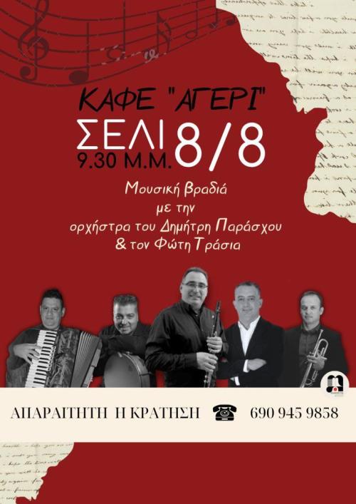 Σέλι: μουσική βραδιά με την ορχήστρα του Δημήτρη Παράσχου και τον βλάχο ερμηνευτή Φώτη Τράσια στο Σέλι 8 Αυγούστου, στο καφέ ΑΓΕΡΙ