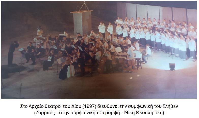Ο Θεοδωράκης ήταν τεράστιο μουσικό μέγεθος και η γνωριμία μαζί του πραγματικός πλούτος. Τον γνώρισα μάλιστα σε μια περίοδο που δεν ασχολούνταν με τη μουσική. Ήταν ’95 – ’96, η εποχή που αρρώστησε και είχε αναμιχθεί και με την πολιτική. Περίοδος δύσκολη. Στην κυβέρνηση τότε Μητσοτάκη, με το να δέχεται πυρά και από αριστερούς και από δεξιούς. Μόλις είχε ανεβάσει στα Σκόπια το συμφωνικό μπαλέτο “Αλέξης Ζορμπάς” και του το ζήτησα να το ανεβάσω κι εγώ. Στην Ελλάδα δεν είχε παιχτεί ακόμα.
