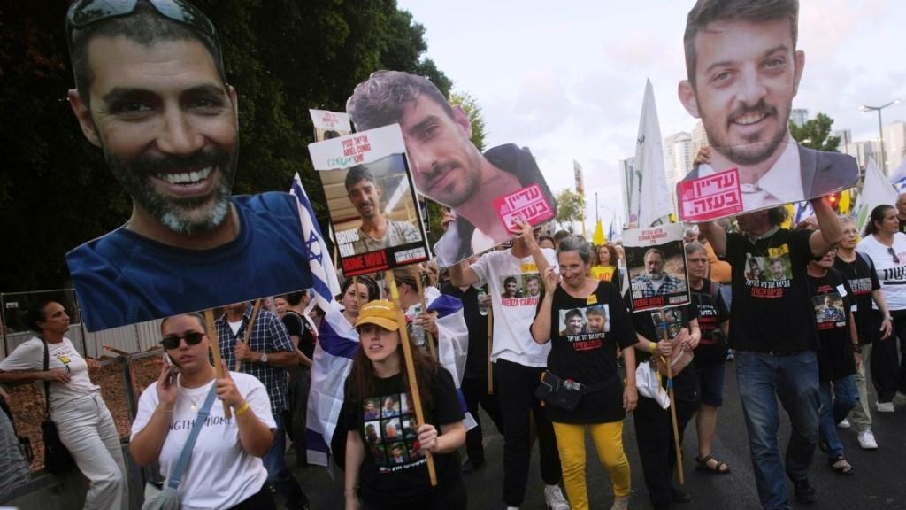 Οι διαδηλωτές κρατούσαν φωτογραφίες των ομήρων, ισραηλινές σημαίες και κίτρινες σημαίες, χρώμα σύμβολο των ομήρων. «Ειρήνη τώρα», «Φέρτε τον πίσω στο σπίτι», έγραφαν τα πλακάτ κάτω από τις φωτογραφίες των 49 ομήρων που εξακολουθούν να κρατούνται στη Γάζα, 27 από τους οποίους θεωρούνται νεκροί από το στρατό.