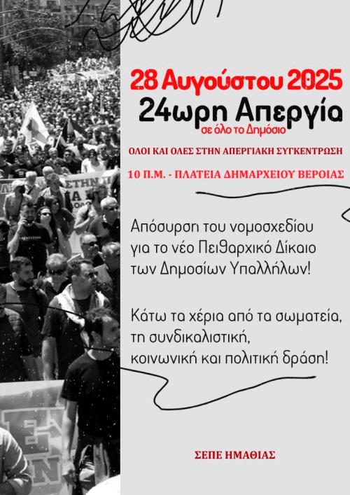 ΣΕΠΕ Ημαθίας: Κάλεσμα συμμετοχής στην απεργιακή συγκέντρωση / Πέμπτη 28 Αυγούστου, Πλατεία Δημαρχείου Βέροιας