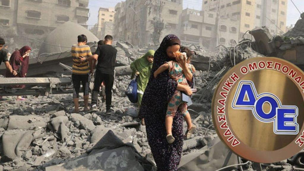Η 94η Γενική Συνέλευση της Διδασκαλικής Ομοσπονδίας Ελλάδος ζητά να σταματήσει τώρα ο πόλεμος και η επιχείρηση του Ισραήλ με σκοπό την κατοχή της Λωρίδας της Γάζας. Παράλληλα, εκφράζει τη συμπαράστασή της στον διαρκή αγώνα του παλαιστινιακού λαού και ζητά να εφαρμοστεί η απόφαση της Γενικής Συνέλευσης του ΟΗΕ από το 1988 με το ψήφισμα 43/177, το οποίο αναγνωρίζει την ανακήρυξη του ανεξάρτητου κράτους της Παλαιστίνης στα σύνορα του 1967, καθώς και η ομόφωνη απόφαση της ελληνικής Βουλής το 2015.
