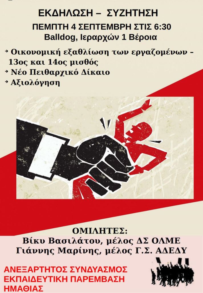 Την Πέμπτη 4/9 στις 18:30 στο «Balldog», Ιεραρχών 1 στη Βέροια ο Ανεξάρτητος Συνδυασμός Εκπαιδευτική Παρέμβαση Ημαθίας διοργανώνει εκδήλωση/συζήτηση για όλα: μισθούς, πειθαρχικά, αξιολόγηση